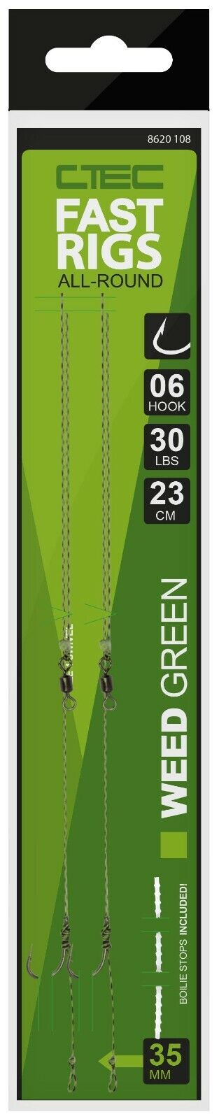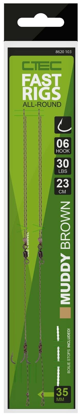 Fast Rigs Allround sind von ihrer Einfachheit geprägt. Das Basic Hair Rig ist wahrscheinlich das am häufigsten verwendete Rig beim Karpfen Angeln. Der super scharfe Haken mit Widerhaken wurde mit einer geschmeidigen, geflochtenen Schnur verbunden. Jedes einzelne Vorfach ist mit einem Gr. 8 Wirbel ausgestattet, welche perfekt in die dafür vorgesehenen CTEC Gr. 8 Safety Clips passen. Wie bei der kompletten CTEC-Terminal Tackle Serie, sind auch die Fast Rigs in den Farben Muddy Brown und Weedy Green erhältlich.