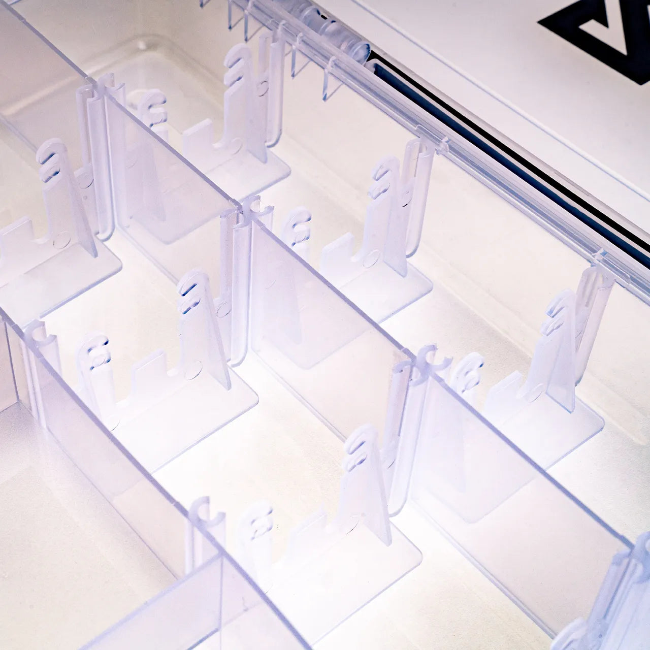 Diese Box ist neben den Trennwänden baugleich mit der Tackle Box WP. Auf die Trennwände kommt es jedoch an. Durch das speziell von uns entwickelte Design kannst du Spinnerbaits und auch Bladed Jigs sicher fixieren.